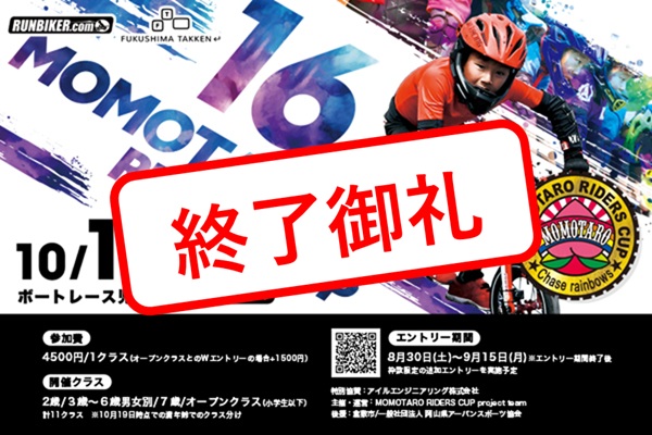 第6回 プレステージ城東CUP 大会終了のお礼 2025年11月23日 - 第6回 プレステージ城東CUP 大きな事故もなく無事終了することができました。 これも、プレステージ城東様、ムラサキスポーツ様、レース参加者の皆様、運営のお手伝… 詳細はこちら
