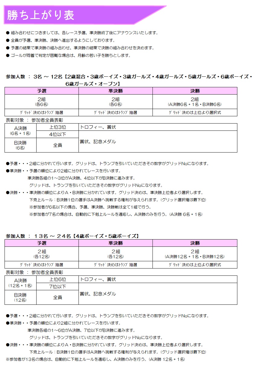 また準決勝以降の組合せは、各レース予選、準決勝終了後にアナウンスいたしますので、ご確認お願いいたします。